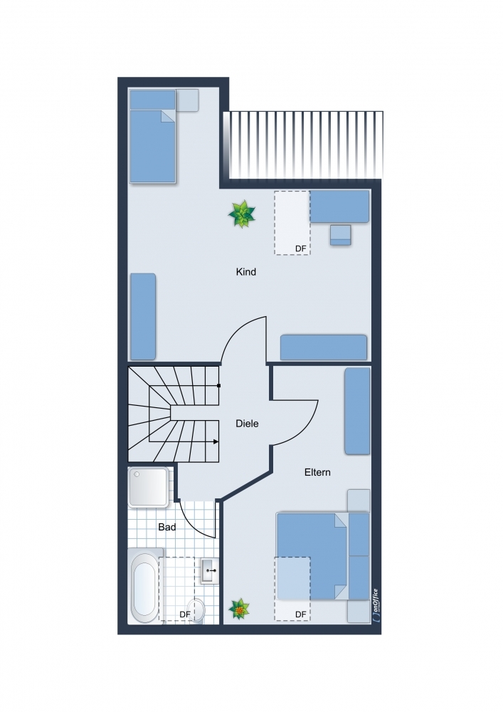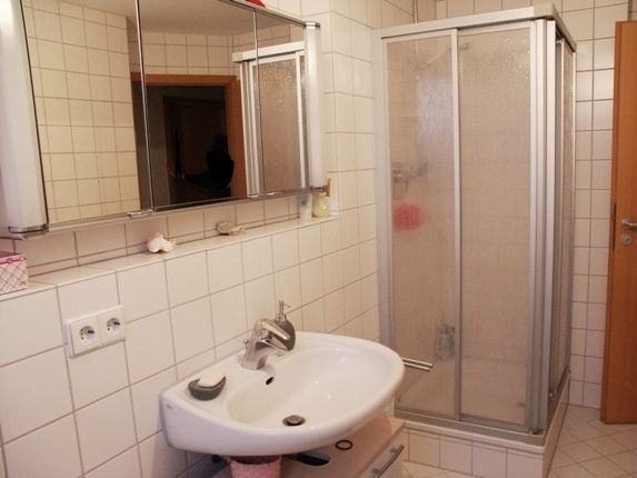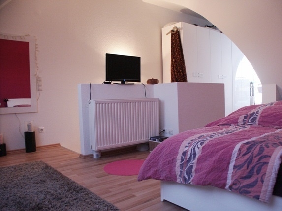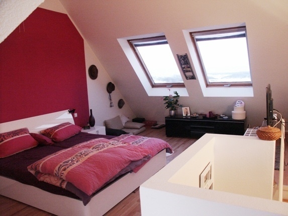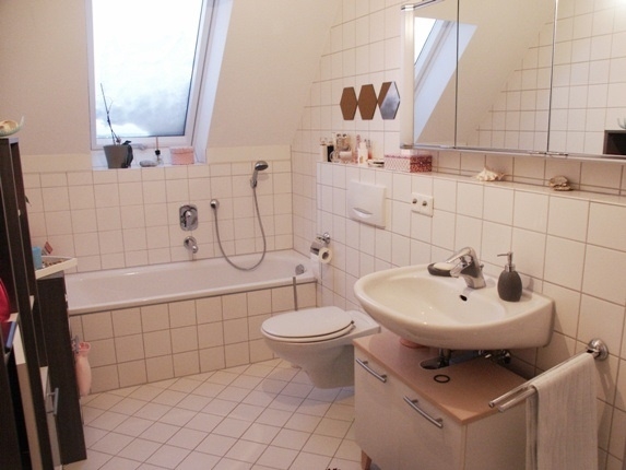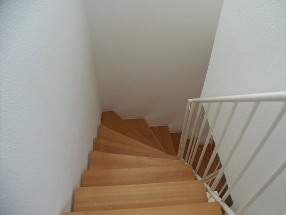 Über die Wendeltreppe gehts in die nächste Etage, hier befindet sich das Schlafzimmer und Kinderzimmer (oder Büro/Gäste), sowie das Bad mit Wanne, Dusche und WC.