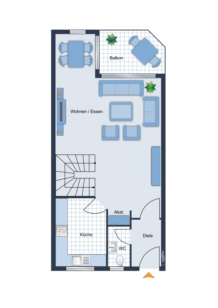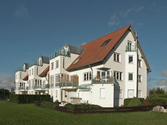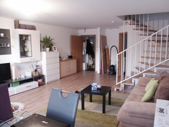 Über einen Laubengang betreten Sie im 1. OG das Haus im Haus. - Eingangsdiele (mit sep. Gäste WC). Ein heller, offen gestalteten Wohn/Eßbereich mit Balkon und großer Fensterfront, mit Zugang zur Küche.
