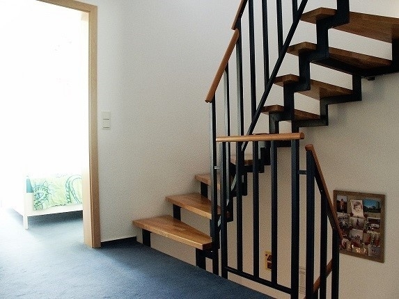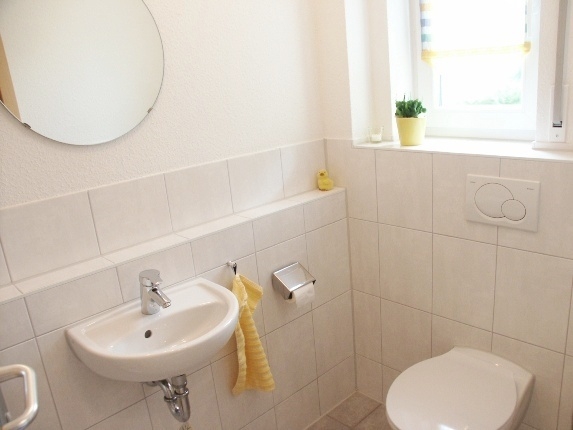 Über eine geschwungene Holztreppe gelangen Sie ins 1. OG zu den weiteren 3 Räumen, nutzbar als ruhige Schlafzimmer, für Hobby oder Büro. -Hier wird statt dem vorhandenen Teppichboden neuer Laminat verlegt. Das Bad mit Wanne, Dusche (Glas) Doppelwaschbecken und WC wird allen Ansprüchen gerecht. Im unteren Eingangsbereich steht Ihnen noch ein zusätzliches Gäste-WC zur Verfügung.