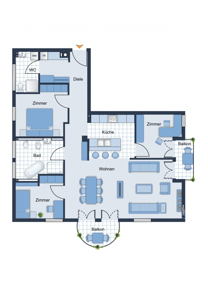 Der großzügiger Wohn/Essbereich mit offen gestalteter Küche / Kochinsel bildet das Zentrum der Wohnung, mit S/W-Balkon zum Marktplatz. Das Kinderzimmer mit Ost-Balkon liegt im Wohnbereich links (s. Plan).
