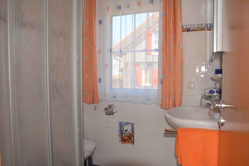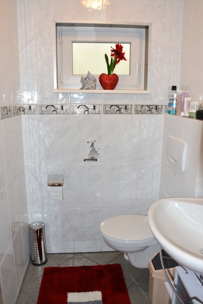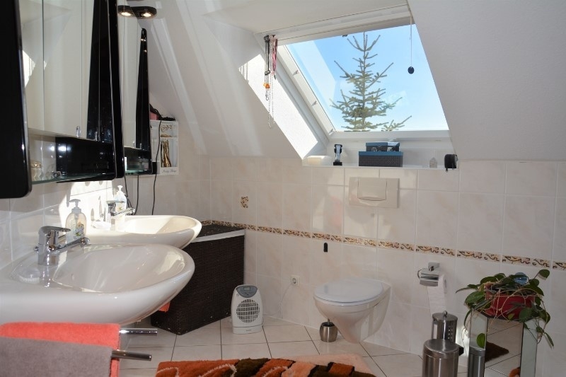 Vervollständigt wird der Schlafbereich im Dachgeschoss mit einem großen Familienbad, welches mit 2 Waschbecken, Dusche, Eckbadewanne und WC ausgestattet ist.