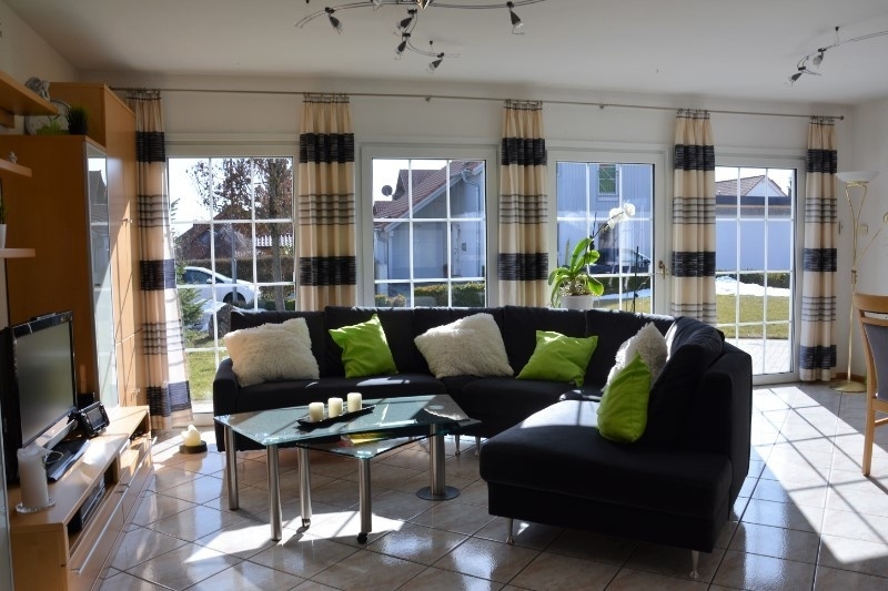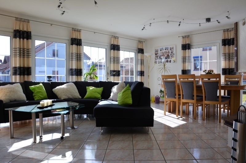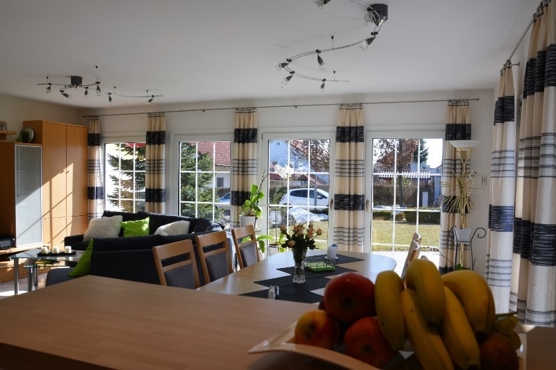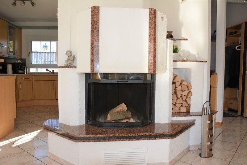 Geradeaus gelangen Sie in den großzügigen und hellen Wohn-Essbereich. Die großen Fensterflächen durchfluten diesen Raum mit Tageslicht. Hier werden Sie buchstäblich von der Sonne geküsst. Ebenerdig gelangen Sie in den Garten und auf die Terrasse, welche nach Süd-Westen ausgerichtet ist. An kalten Abenden werden Sie die wohltuende Wärme des offenen Kamins lieben.