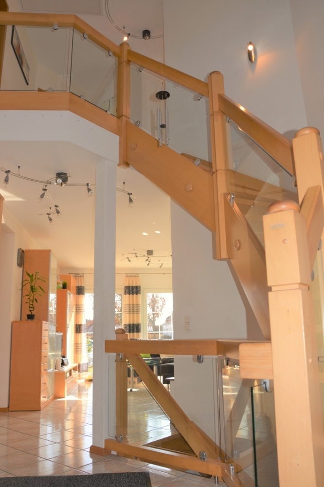 Vom lichtdurchfluteten Eingangsbereich gelangen Sie rechts über eine Holztreppe in das Dachgeschoss.