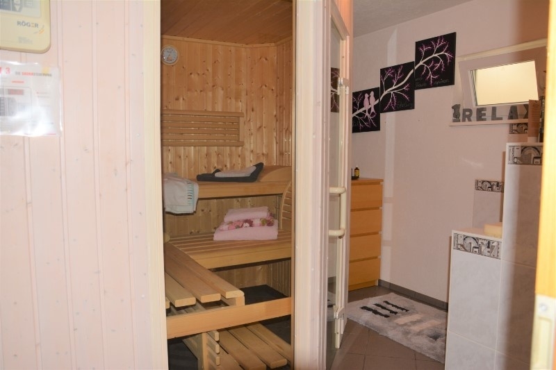 Das absolute Highlight des Untergeschoss, wenn nicht sogar des ganzen Hauses, ist der Wellnessbereich: mit Sauna und Dusche. Komplettiert wird das Ganze noch von einem separaten WC. Gegenüber befindet sich die Waschküche mit der Haustechnik.