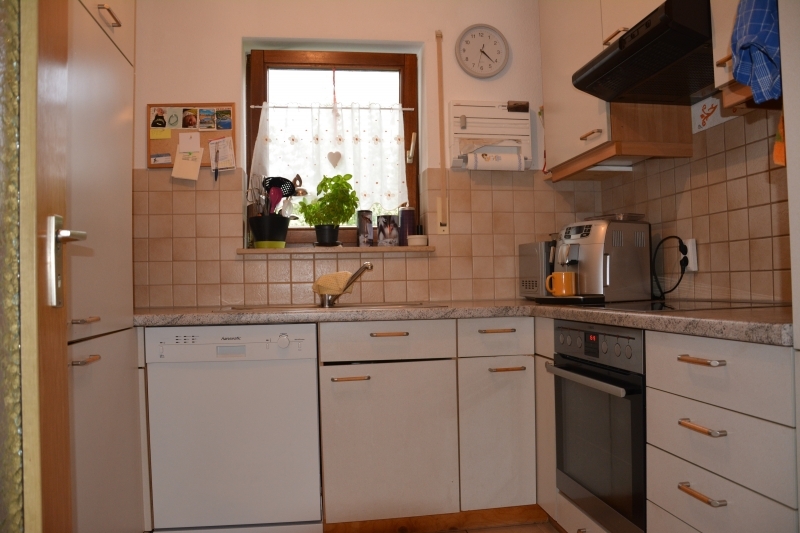 Die Küche befindet sich gegenüber vom Essbereich und ist mit allen elektrischen Geräten ausgestattet. Diese Geräte können vom Mieter gegen Entschädigung übernommen werden, die Küchenmöblierung an sich gehört zur Wohnung.