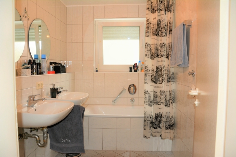 Das Badezimmer mit Tageslicht ist mit 2 Waschbecken und einer Badewanne ausgestattet. Die Einbauküche kann nach Absprache übernommen werden.