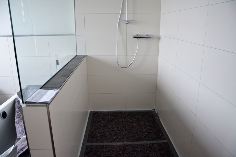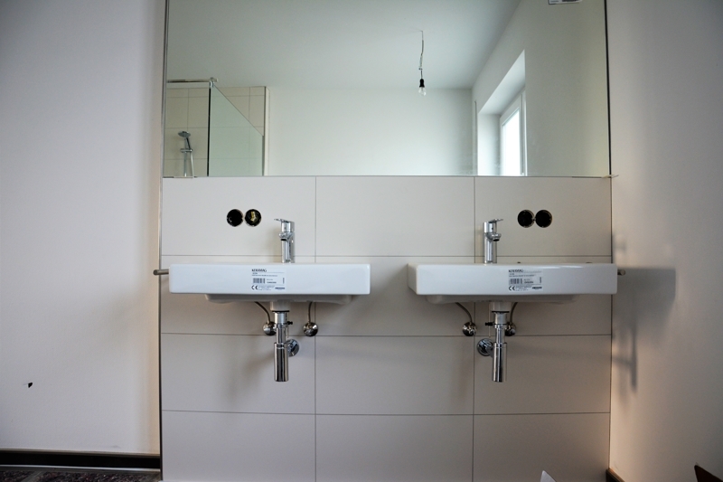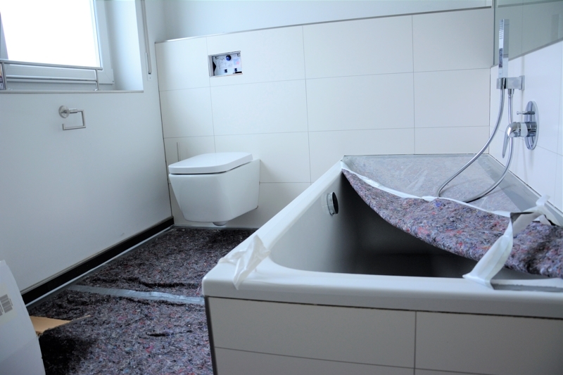 Das Bad mit Wanne, begehbarer Dusche, Doppelwaschbecken und WC wird allen Ansprüchen gerecht.