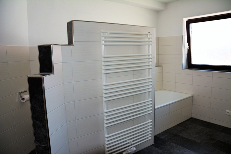 Über den Flur gelangen Sie in die beiden Schlafräume, nutzbar als Schlafzimmer und als Kinderzimmer oder Büro. Gegenüber der Einbauküche befindet sich das modern ausgestattete Bad mit Dusche, Badewanne, Waschbecken und WC. Ein Gäste WC ist gleich nebenan.