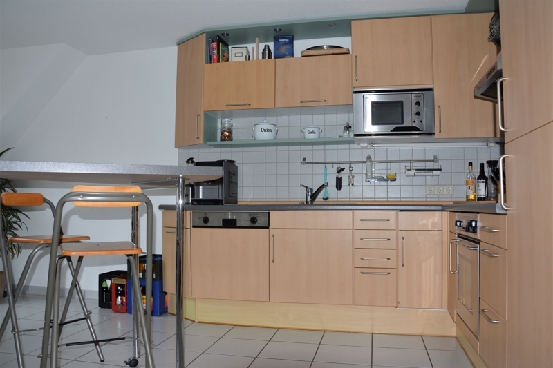 Unten der offene Küchen- Ess Bereich mit integrierter Einbauküche. Neben dem Eingang befindet sich zudem ein separates WC mit Waschmaschinenanschluss.