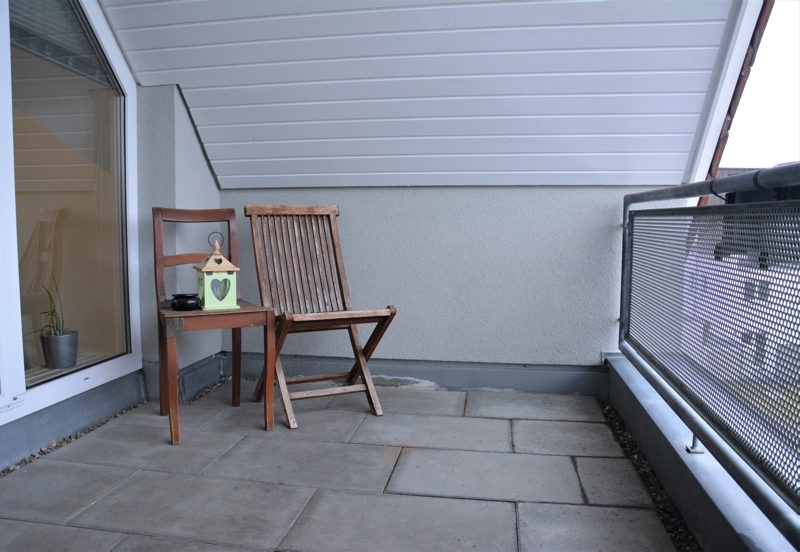 Das Herzstück der Wohnung befindet sich die Treppe hinauf. Ein helles Wohnzimmer mit angrenzendem Balkon, der komplett überdacht ist. Auf der anderen Seite befindet sich das Schlafzimmer. Dazwischen das innen liegende Badezimmer, welches sowohl mit einer Badewanne als auch einer Dusche ausgestattet ist.
