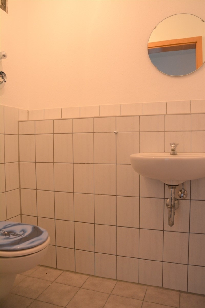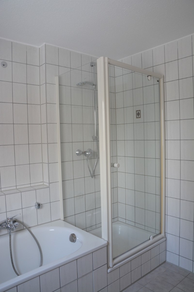 Das Badezimmer mit Tageslicht ist mit 2 Waschbecken, einer Badewanne und einer Dusche ausgestattet. Das separate WC grenzt direkt an das Badezimmer an.