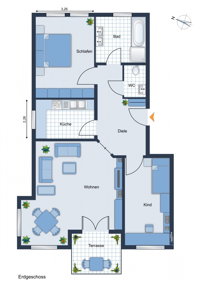 Das geräumige Wohn-/Esszimmer bietet mit den nahezu bodentiefen Fenstern viel Licht. Im offenen Wohnbereich mit inegrierter Essecke, findet die kleine Familienrunde ausreichend Platz. Vom Wohnzimmer aus gelangen Sie auf die mit Hecken schön eingewachsene Terrasse, auf der Sie ihre Sonnenstunden in aller Ruhe genießen können.