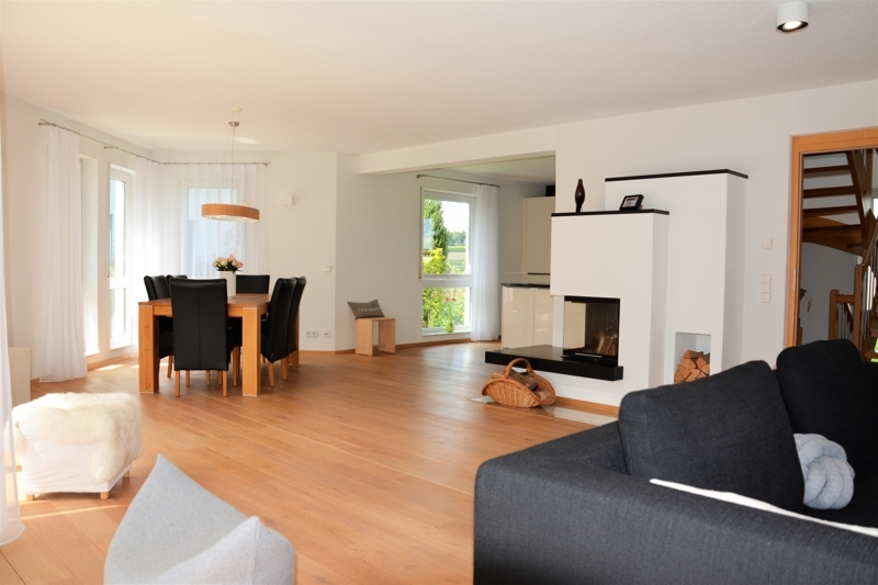 Mittelpunkt des Wohnlebens: der komplett offene Wohn-Essbereich mit integrierter Küche auf 62,5 qm. Hier haben Sie nicht nur bodentiefe, lichtdurchflutete Fenster mit ebenerdigem Zugang zu Terrasse und Garten, ebenso genießen Sie von der Küche wieder den atemberaubenden Blick auf Felder und Wiesen.