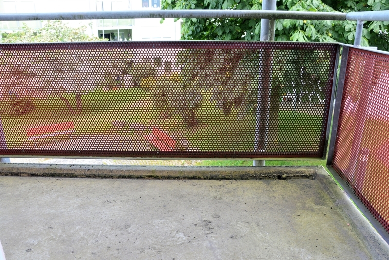 Vom Wohnraum aus geht es raus auf den Balkon mit Blick in den Wohnpark. Dieser ist mit vielen Bäumen und Sträuchern angelegt und bietet einen Spielplatz mit Sitzgelegenheit.