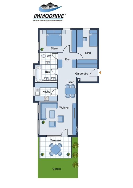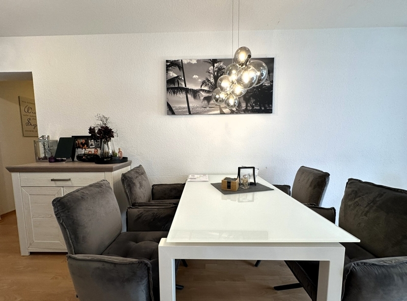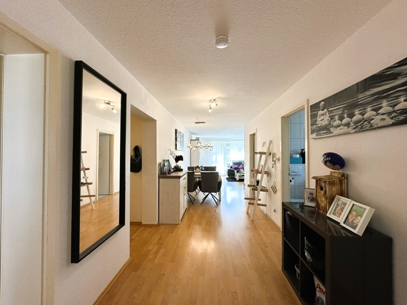 Die Wohnung ist prima aufgeteilt, das Zentrum der Wohnung bildet das offene Wohn-Esszimmer mit Zugang zur Terrasse und dem Gartenbereich. Hier haben Sie Sonne satt.