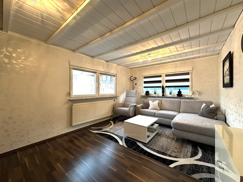 Im Wohnzimmer erwartet Sie ein heller, harmonischer Raum mit Holzakzenten für den richtigen Wohlfühlfaktor.