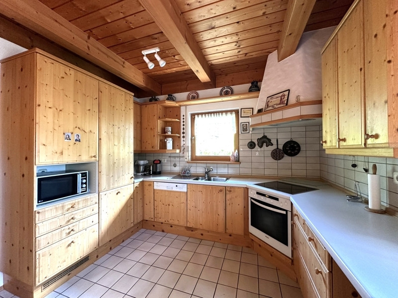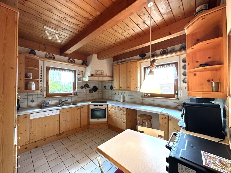Das Esszimmer überzeugt durch eine großzügige Lichtfläche und schafft eine helle, freundliche Atmosphäre – ideal für gemeinsame Mahlzeiten und gesellige Stunden. Auch die Küche fügt sich harmonisch in das Gesamtbild ein.