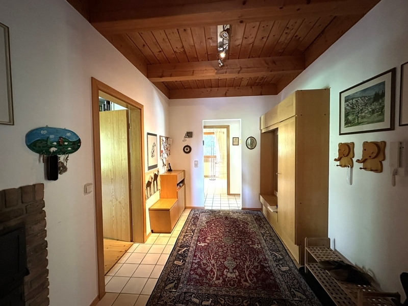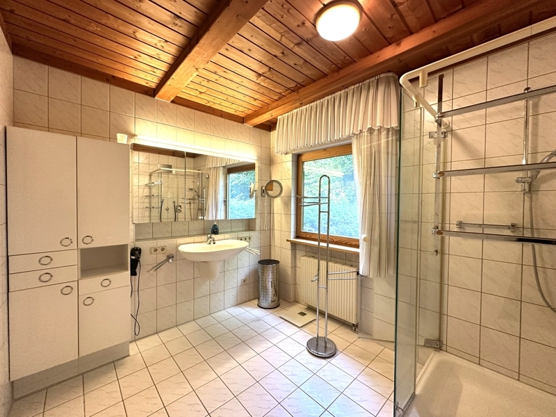 Das Badezimmer ist komfortabel ausgestattet mit Dusche, Badewanne und WC – ideal für Familien oder Gäste. Die hohen Decken verleihen dem gesamten Wohnbereich eine warme, luftige Ausstrahlung.