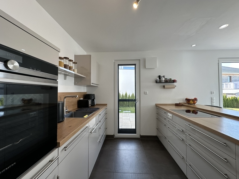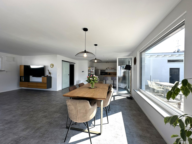 Das Erdgeschoss ist der Dreh- und Angelpunkt des Lebens. Der lichtdurchflutete Wohn- und Essbereich mit über. 48 m², kombiniert mit einer offenen Küche mit zusätzlichen 9m², ist der perfekte Ort für gemeinsame Zeit mit der Familie – sei es bei einem entspannten Abendessen oder lebhaften Gesprächen mit Freunden. Von hier aus geht es ebenerdig direkt in den Garten. Das Leben drinnen und draußen verschmilzt zu einem harmonischen Ganzen.