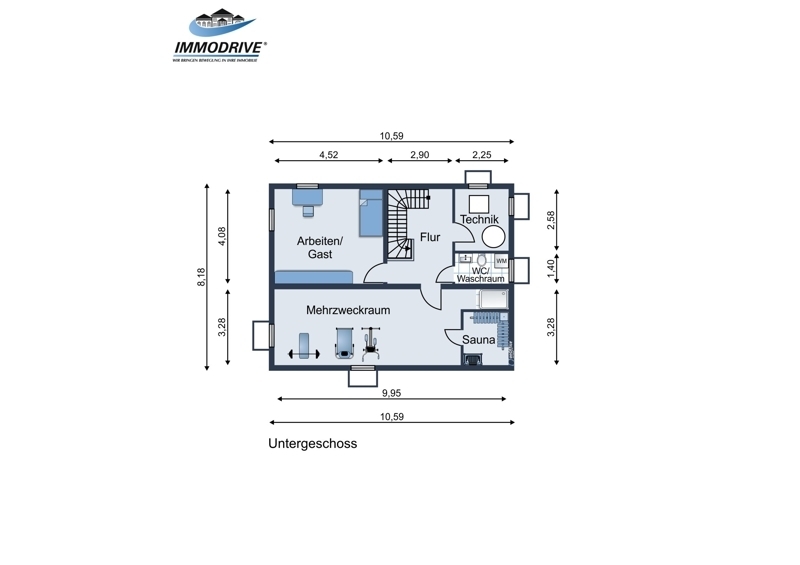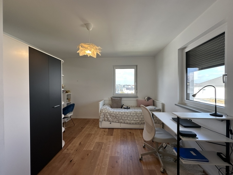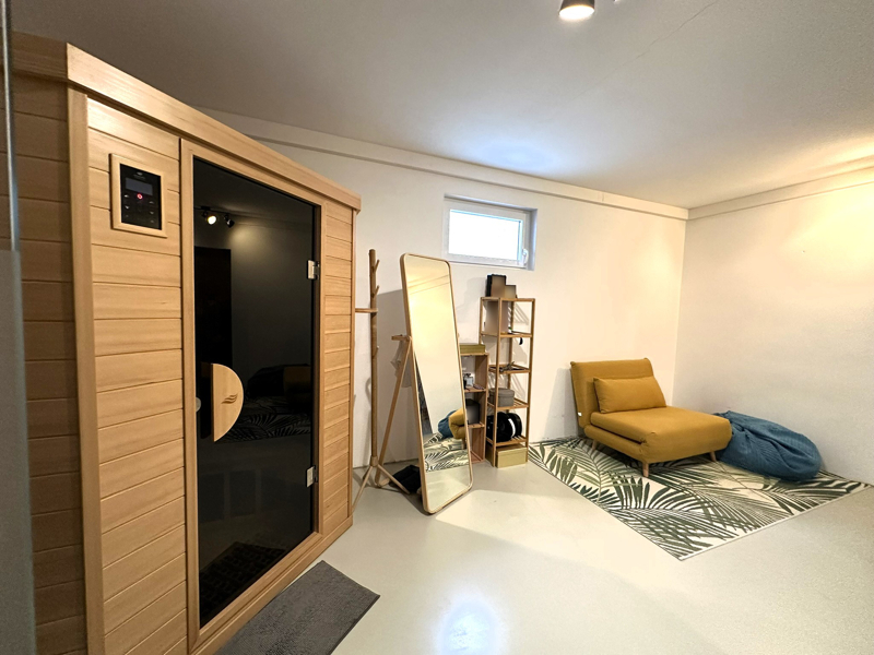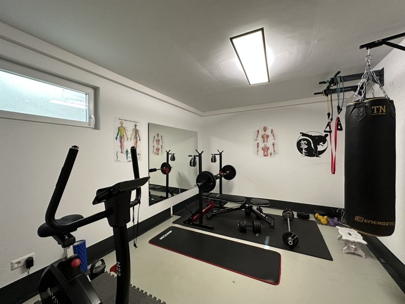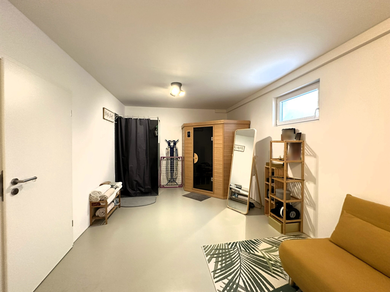 Das Untergeschoss überrascht mit einem ausgebauten, großzügigen Zimmer – ideal für die Bedürfnisse moderner Familien. Ob als Refugium für größere Kinder, als Homeoffice für produktive Stunden oder als Gästebereich für Ihre Liebsten – die Möglichkeiten sind grenzenlos. Der zusätzliche Mehrzweckraum wird derzeit als Fitnessraum mit einer Infrarotkabine genutzt. Er wird zum privaten Wellnessbereich, der zu Entspannung und Regeneration einlädt.