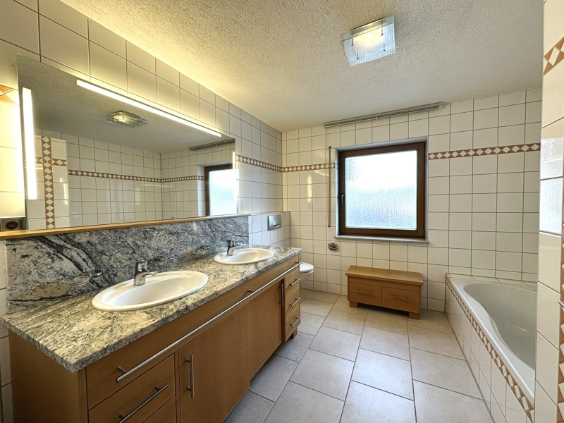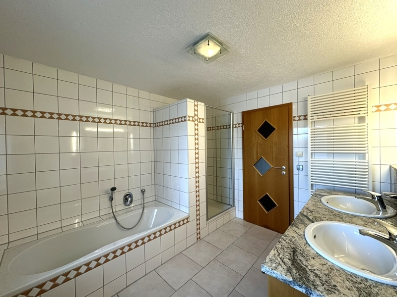 – Badezimmer im Obergeschoss mit Badewanne, Dusche, WC und zwei Waschbecken mit Unterschrank
