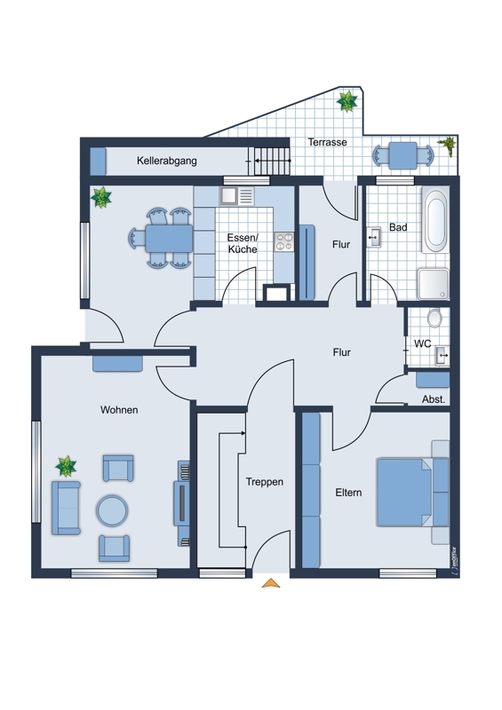 Links neben dem Bad führt ein weiterer Flurdurchgang zur Terrasse, die süd-westlich ausgerichtet ist. Hier können Sie die Abendsonne genießen.