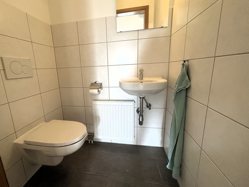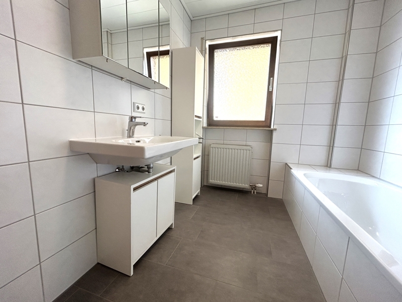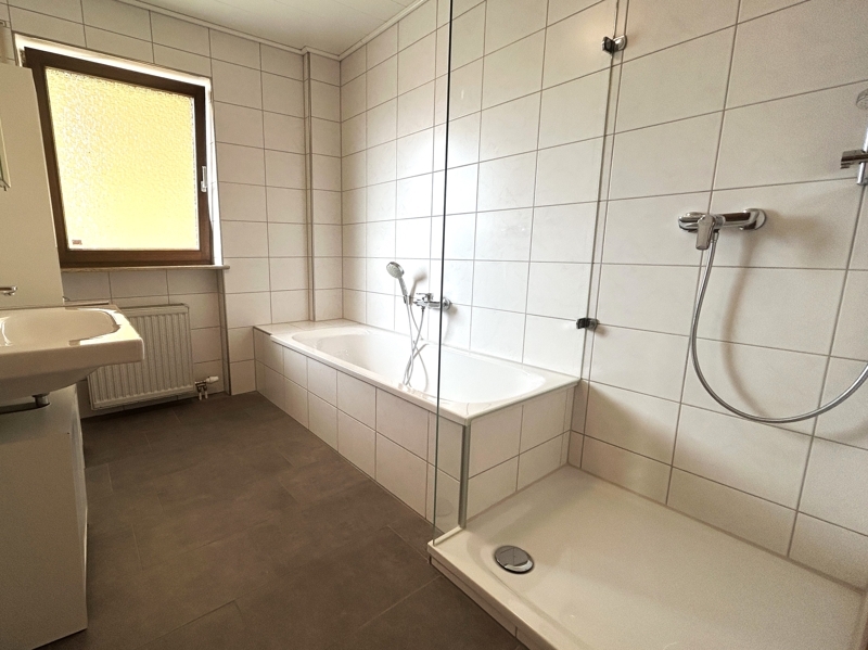 Das Badezimmer mit Tageslicht ist mit einem Waschbecken, einer Badewanne und einer Dusche ausgestattet. Das separate WC grenzt direkt an das Badezimmer an.