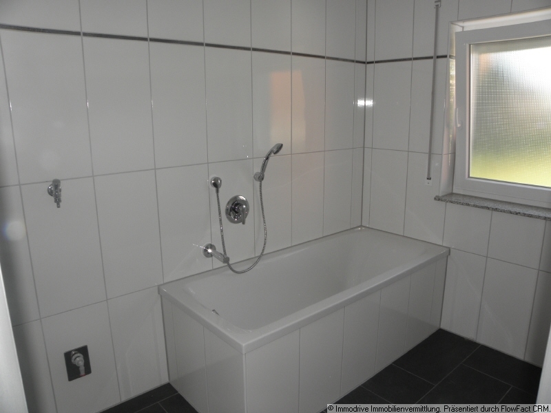 modernes Bad raumhoch gefliest mit Wanne und Dusche, Waschbecken |