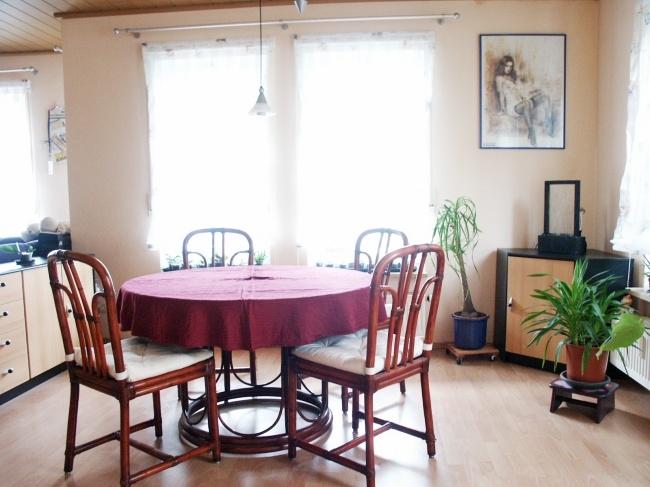 Das Wohnzimmer ist groß genug für einen gemütlichen Essbereich, direkt von der Küche mit ein paar Schritten erreichbar. - Auch in der Küche, die eine Türe nach Draußen hat zum Kräuterbeet, läßt sich ein Frühstücksbereich einrichten.