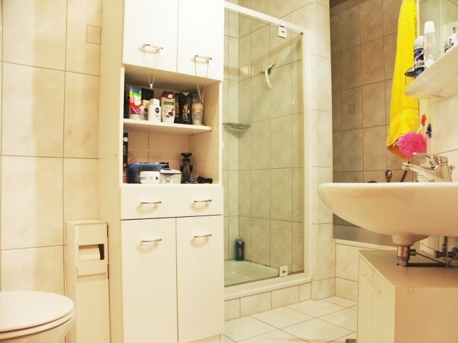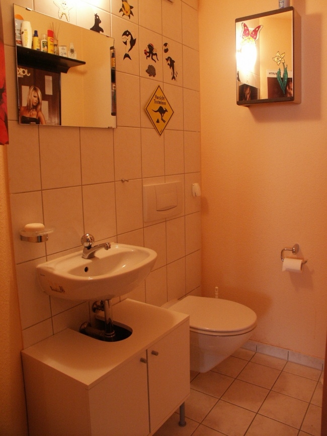 Vom Flur aus ist das zusätzliche Gäste-WC und das Badezimmer mit Wanne , Dusche ,WC und Wachbecken zu erreichen. Ein Kinderzimmer und Ihr Elternschlafzimmer liegen, wie die Terasse, auf der Rückseite des Gebäudes.