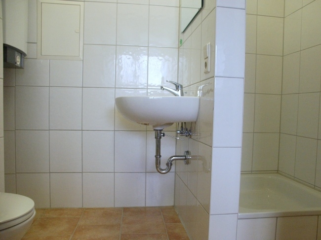 - Bad mit Dusche, Waschbecken, WC.