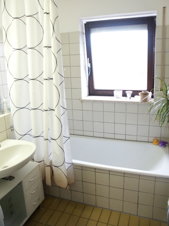 Ein helles Badezimmer mit Duschwanne und ein separates WC befinden sich direkt neben den Schlafzimmern.
