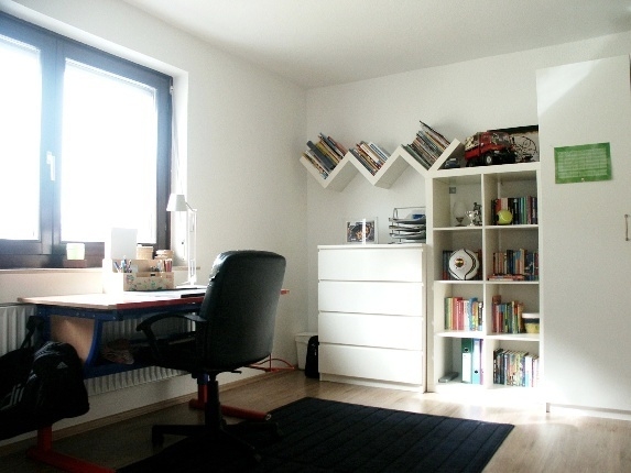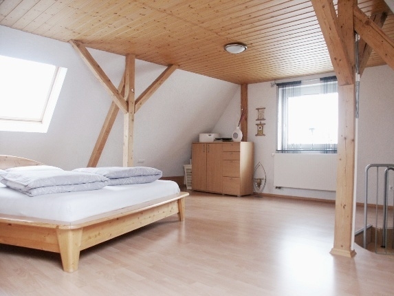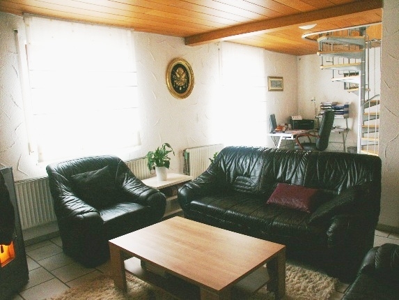 Vom Wohnzimmer aus haben Sie Zugang zur außergewöhlich großen Sonnenterasse - den Sommer genießen ! Kinder sind hier der Straße fern und in Sicherheit. Im Wohnzimmer besteht die Möglichkeit einen Kaminofen aufzustellen. Über eine kleine Wendeltreppe gelangen Sie in die nächste Etage. Der offen gestaltete Studiobereich (+ begehbarem Schrank) mit Holzbalken unterstreicht die charmante Atmosphäre.