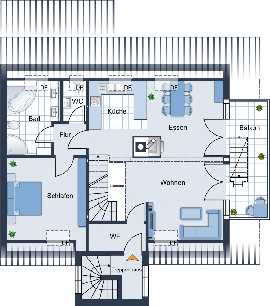 Über eine schöne Treppe geht's nach oben, das Studio mit Dachterrasse und ein großes Kinderzimmer vervollständigen dieses tolle Wohnambiente.