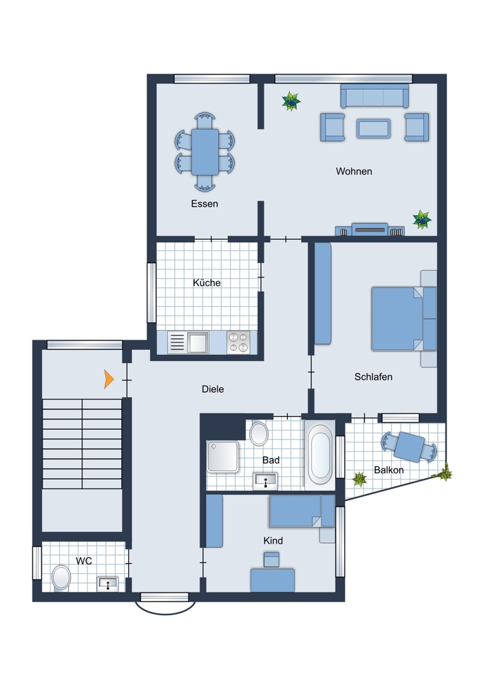 ( Im 1. OG befindet sich eine identisch geschnittene Wohnung, mit geringen Abweichungen der Ausstattung (weiße Türen, andere Fliesen).