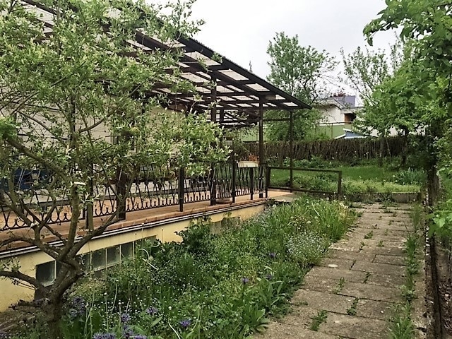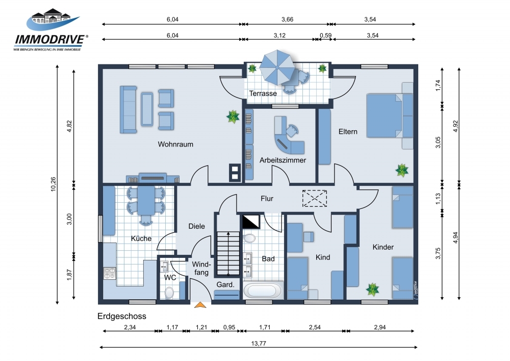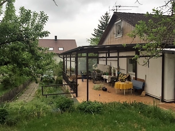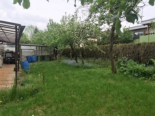 Das Grundstück besticht durch viel Grün, optimaler Weise vor und hinter dem Haus, und einer großen überdachten Terrasse. Also Sonne satt.