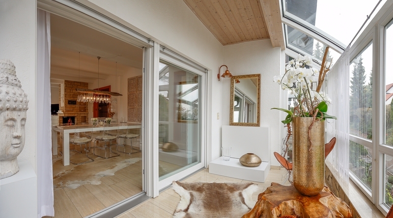 Nun gehen wir aber ins neue Heim; bequem ebenerdig gelangen wir ins Erdgeschoss. Dürfen wir Sie in Ihr Wohn- Esszimmer bitten? Alles ist gekonnt und mit viel Liebe zum Detail dekoriert. Es ist hell und groß, großzügig geplante 61 Quadratmeter Lebensfläche. Da ist ausreichend Platz für Ihren einladenden Esstisch und die Entspannungscouch. Den offenen Kamin und integrierten Wintergarten werden Sie lieben.