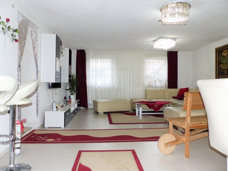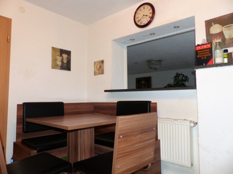 Der Familiemittelpunkt bildet das geräumige Wohn-Esszimmer im Erdgeschoss. Dieses ist durch eine Durchreiche mit der Küche verbunden.