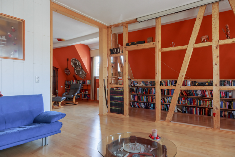 Das 2. Dachgeschoss ist teilweise offen bis zum Dachspitz. Auf dieser Ebene finden Sie ein Wohnstudio mit 29 m² und eine nicht ausgebaute Bühne.