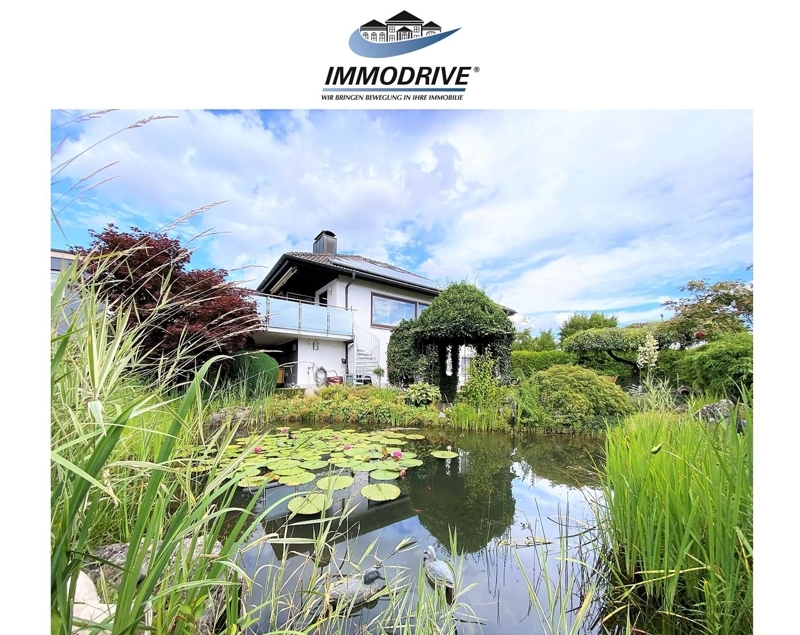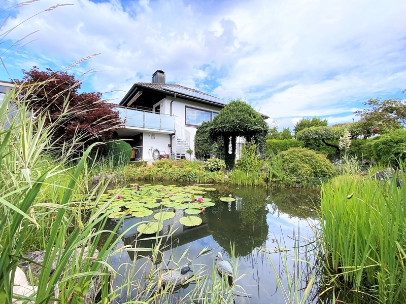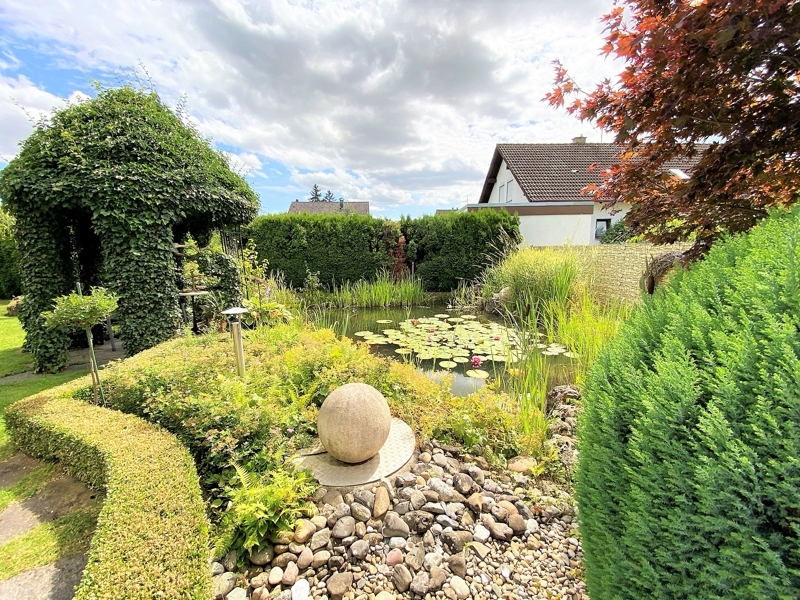 Werfen wir einen Blick in den Garten, bevor wir reingehen: Sorgfältig gestutzte Buchsbäume, dichte Sträucher, Rasen und hübsche Beete. Es duftet nach Lavendel, nach dem lieblichen Duft von Rosen und der Süße von Hortensien. Und dann haben wir noch den hübschen Teich mit Seerosen, Fischen, Wasserfontänen und einem integrierten Bachlauf. Vom überdachten Freisitz aus haben Sie einen herrlichen Blick darauf.