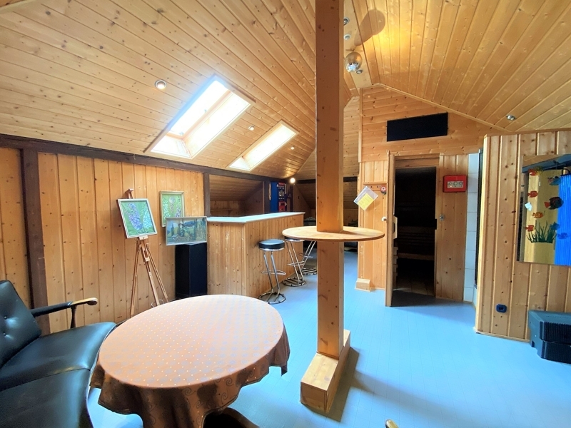 Ein weiteres großes Zimmer, etwas versteckt, wartet ganz oben im Dachgeschoss. Die Eigentümer haben sich hier einen Partyraum mit Sauna gestaltet. Dieser Raum bietet sich aber auch super als Spielzimmer, zum Toben für Ihre Kinder oder als Büro an.