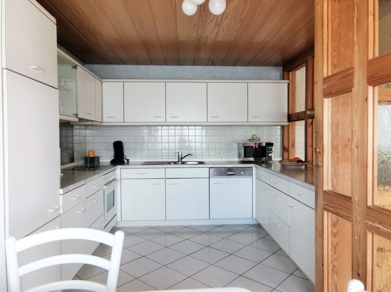 Durch Fachwerk und Glaselemente getrennt und doch integriert, befindet sich nebenan die Küche.