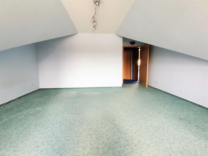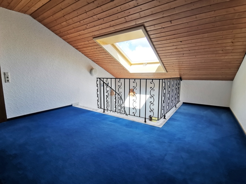 Über eine offene Marmortreppe gelangen Sie ins Dachgeschoss. Hier befinden sich zwei weitere Schlafzimmer. Eins mit Süd-Balkon, das andere mit Blick über Felder und Wiesen. In einem weiteren Raum wurden die Anschlüsse für ein Badezimmer vorbereitet. So können Sie größeren Kindern ein fast eigenständiges Leben im Dachgeschoss ermöglichen.