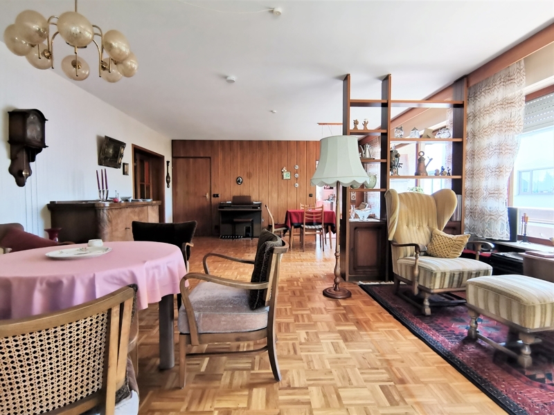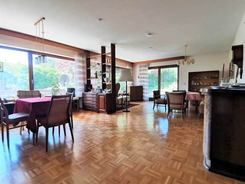 Lebensmittelpunkt der 3,5 Zimmer Wohnung im Erdgeschoss ist das offene Wohn-Esszimmer in Größe XXL. Große Fenster mit reichlich Tageslicht, das sich im Parkettboden spiegelt. Genügend Platz für eine große, gemütliche Sofaecke und ein perfektes Dinner am großen Speisetisch.