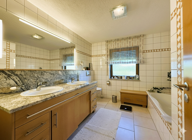 – Badezimmer im Erdgeschoss mit Badewanne, WC und zwei Waschbecken mit Unterschrank