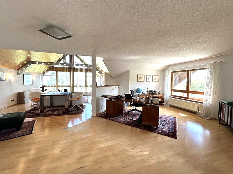 Über eine Treppe gelangt man zusätzlich in den ausgebauten Dachspitz, der weiteren Platz für individuelle Nutzungsideen bietet – ob als Arbeitsbereich, Hobbyraum oder zusätzlicher Stauraum.