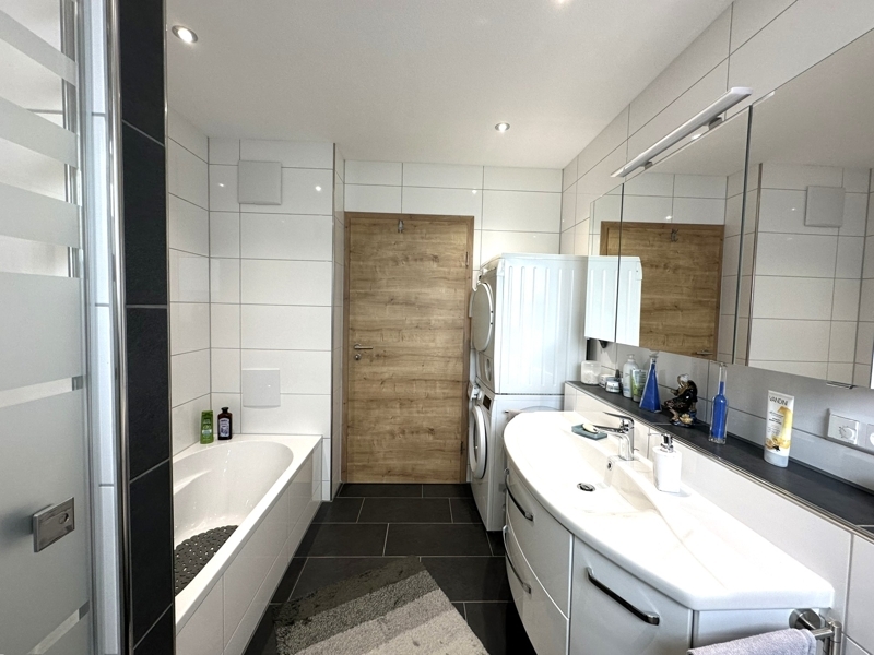 Der Wohnbereich ist mit einem strapazierfähigen Vinylboden und einer angenehmen Fußbodenheizung ausgestattet. Elektrische Rollläden sorgen für zusätzlichen Komfort. Das Badezimmer ist vollständig gefliest und verfügt über eine Dusche sowie eine Badewanne. Waschmaschinenanschlüsse sind sowohl im Badezimmer als auch im gemeinschaftlichen Waschraum vorhanden.