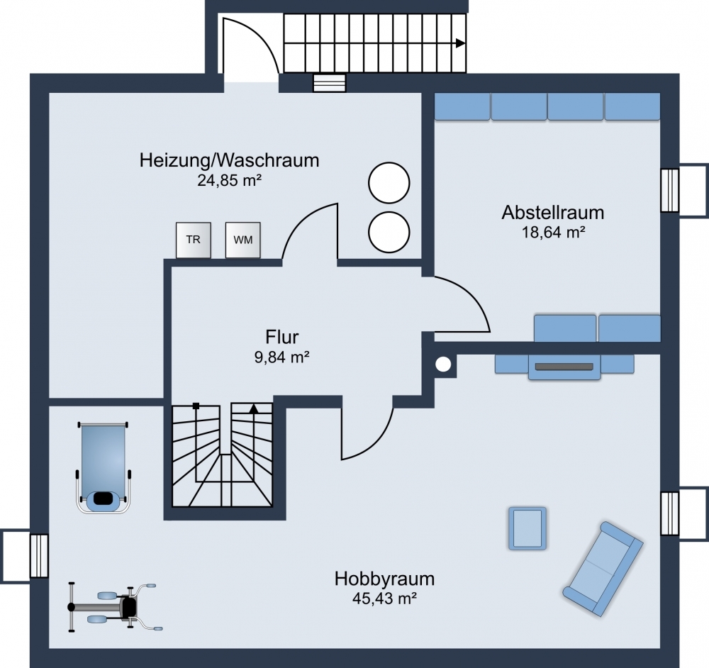 Im Untergeschoss erwartet Sie weiter ein großzügiger Hobbyraum, welcher mit ca. 45m² ausreichend Raum für die Hobbys bietet, aber auch sehr gut als Büro genutzt werden kann.