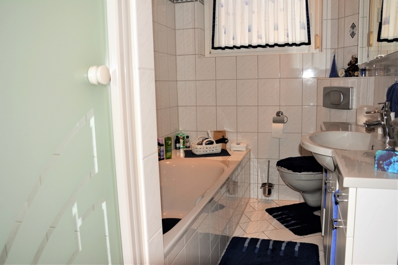 Über den Flur gelangen Sie zum modern ausgestatteten Bad mit Dusche, Badewanne, Waschbecken und WC.