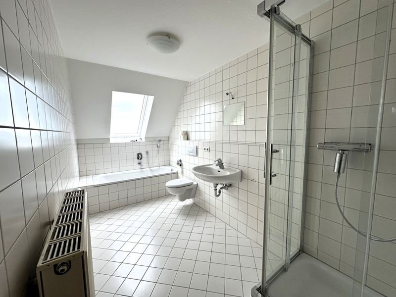 Über die Wendeltreppe gehts in die nächste Etage, hier befindet sich das Schlafzimmer und Kinderzimmer (oder Büro/Gäste), sowie das Bad mit Wanne, Dusche und WC.